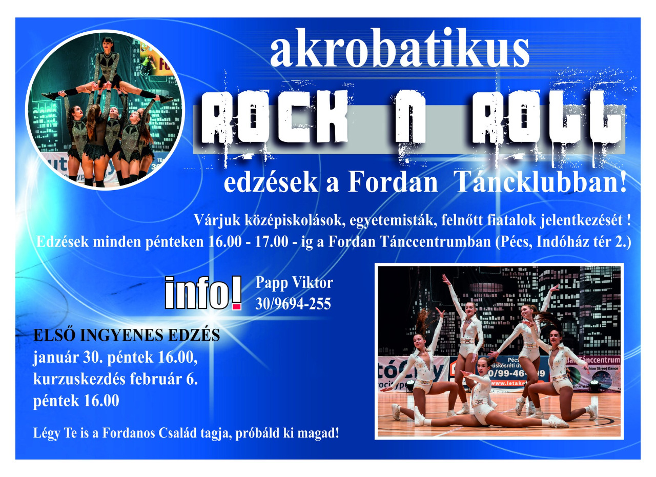 Akrobatikus Rock 'n' Roll középiskolásoknak, egyetemistáknak és fiatal felnőtteknek 2026.01.13 17:45 Ingyenes nyílt óra január január 30. péntek 16.00, kurzuskezdés február 6. péntek 16.00